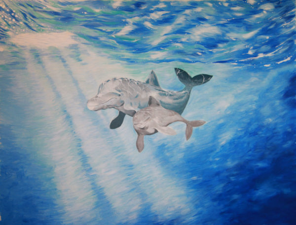 -Une murale en papier peint sous les mers d’une maman dauphin et son bébé. Oeuvre originale de Ruth Baker.