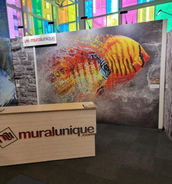 -Murale colorée, originale et exclusive de deux poissons discus oranges sur fond gris. Si vous recherchez à créer un décor hors du commun, cette murale pourrait être une très bonne option.