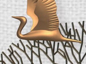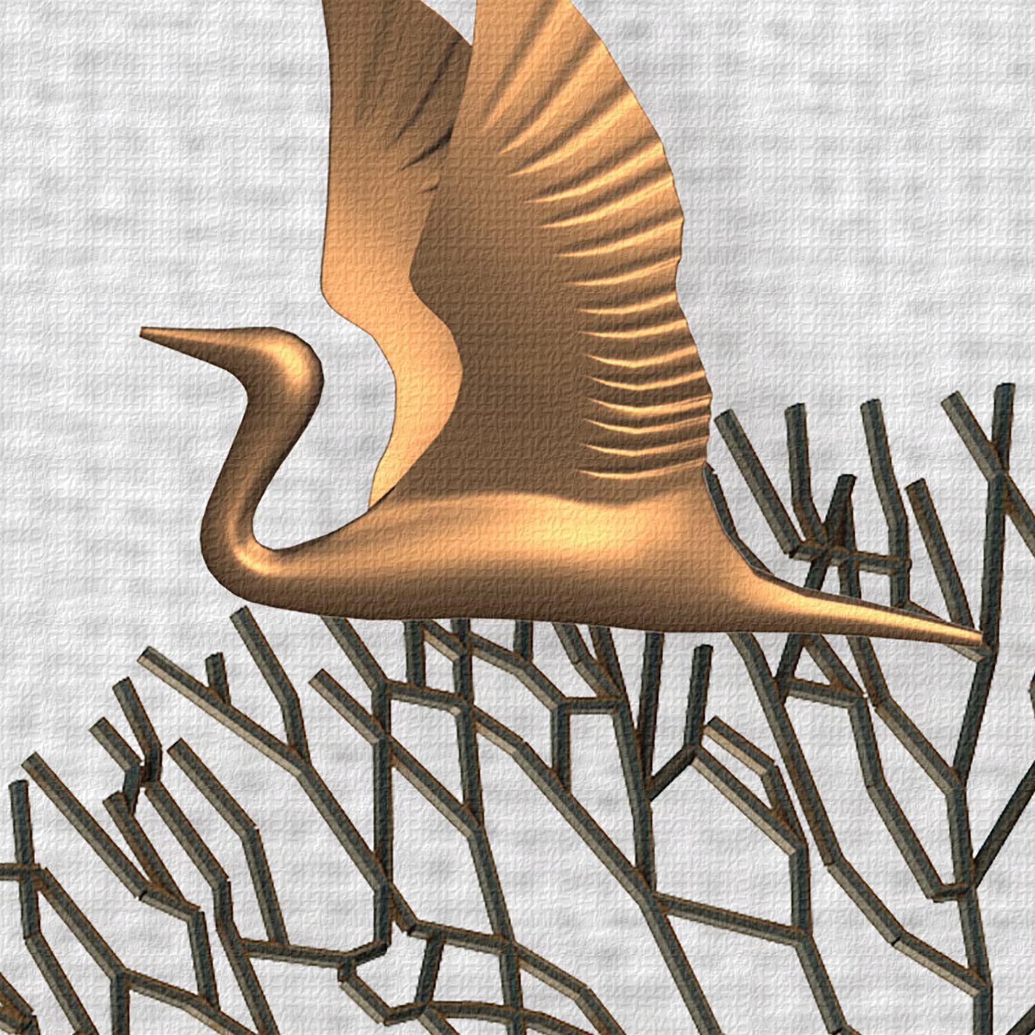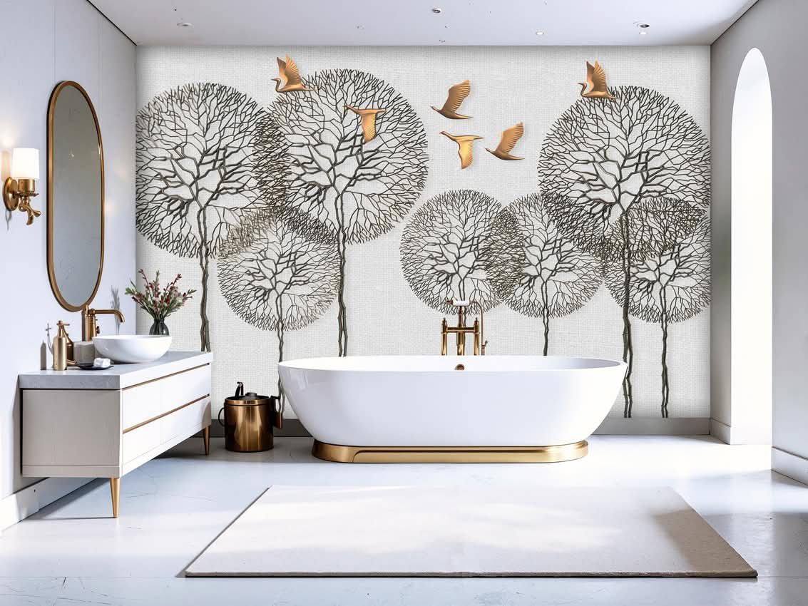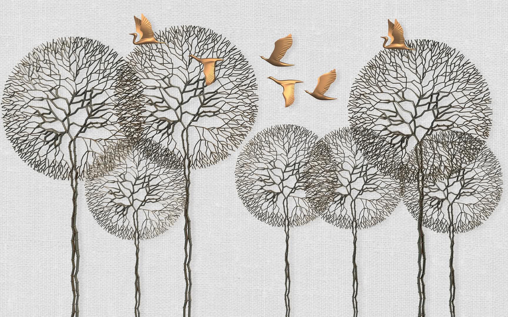 Arbres futuriste stylisés avec oiseaux dorés sur toile imprimée.