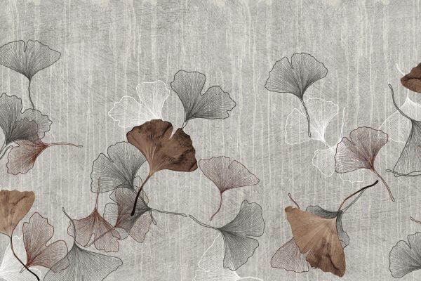Notre murale « Feuilles de ginkgo » est un motif magnifique et très apprécié. Elle présente une composition de feuilles de ginkgo entrelacées dans des tons ocres, beiges et anthracite, sur un fond texturé.