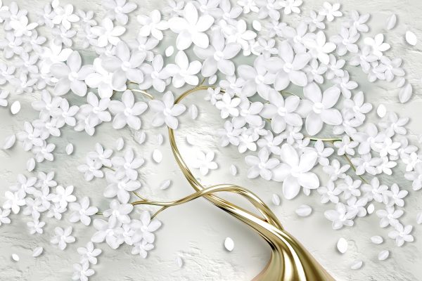 -Murale en papier peint d’un arbre au tronc doré avec de jolies fleurs blanches sur fond blanc. Murale en 3d avec un bel effet de profondeur.
