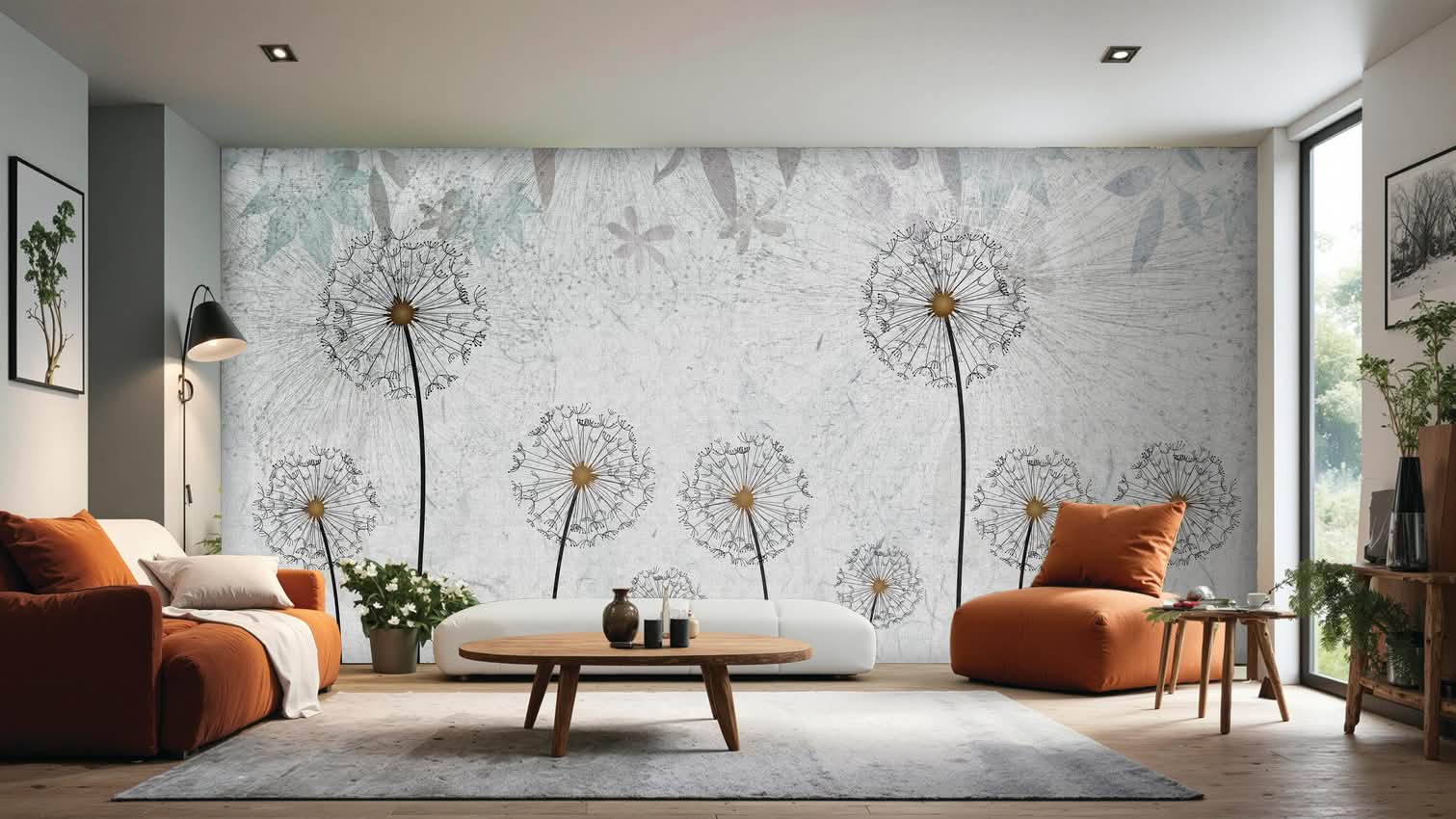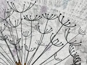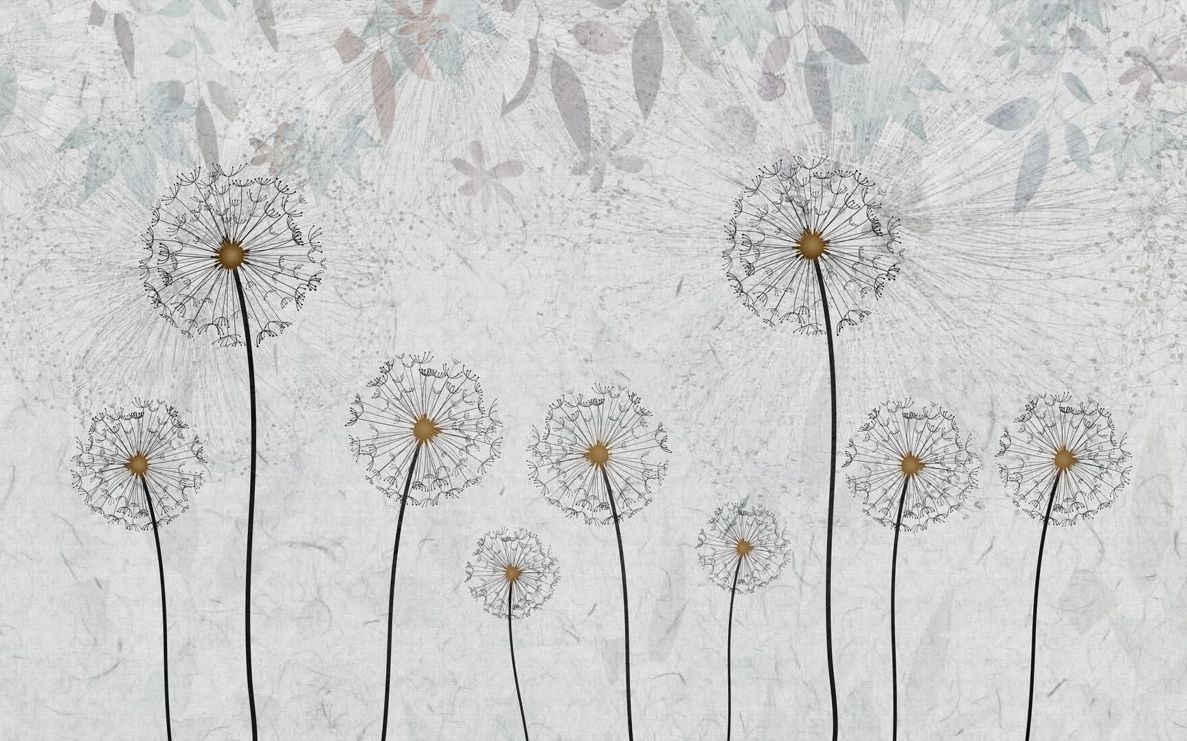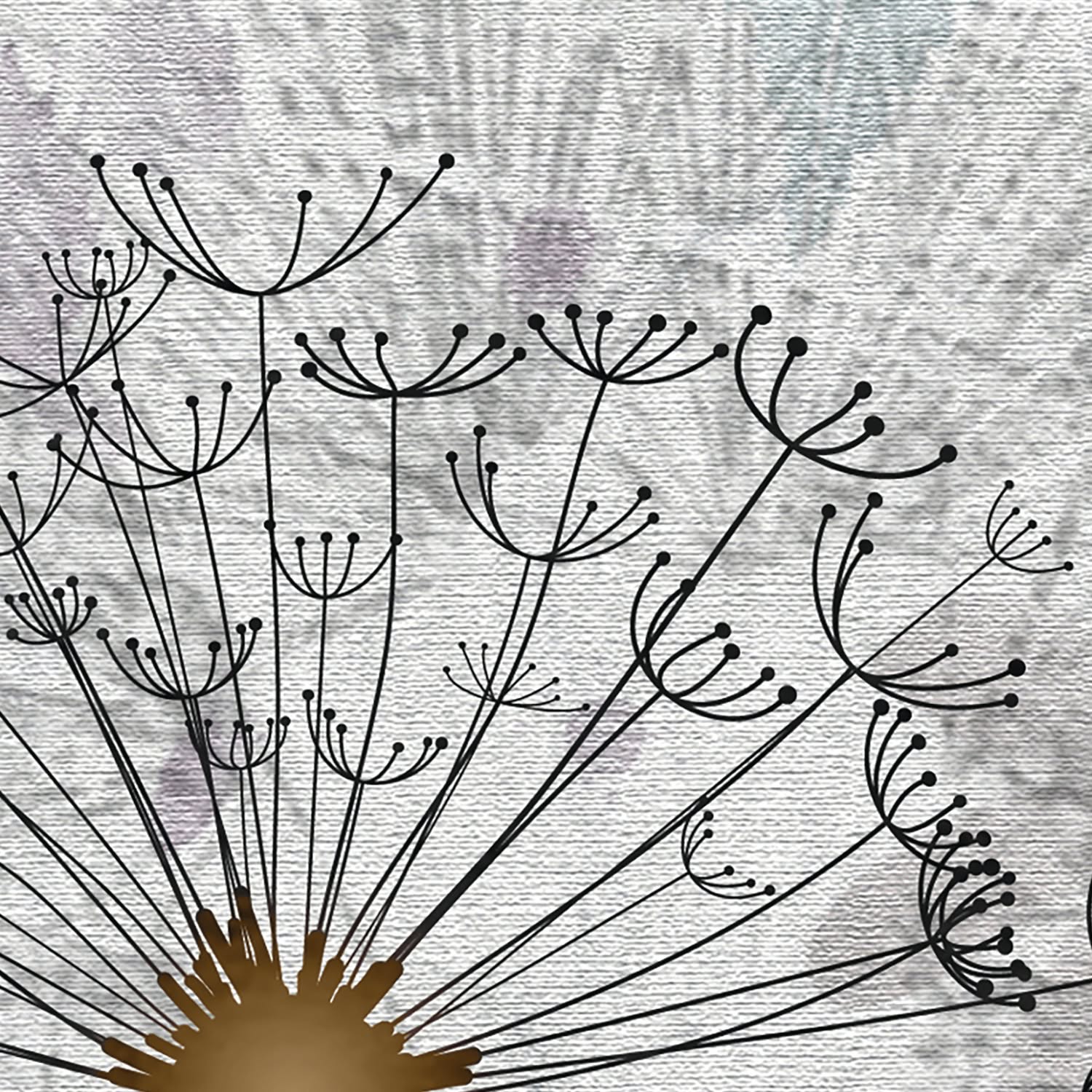 Pissenlits artistiques noir aux centres bronze sur fond végétal gris texturé.