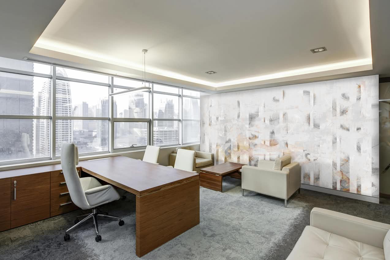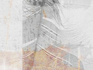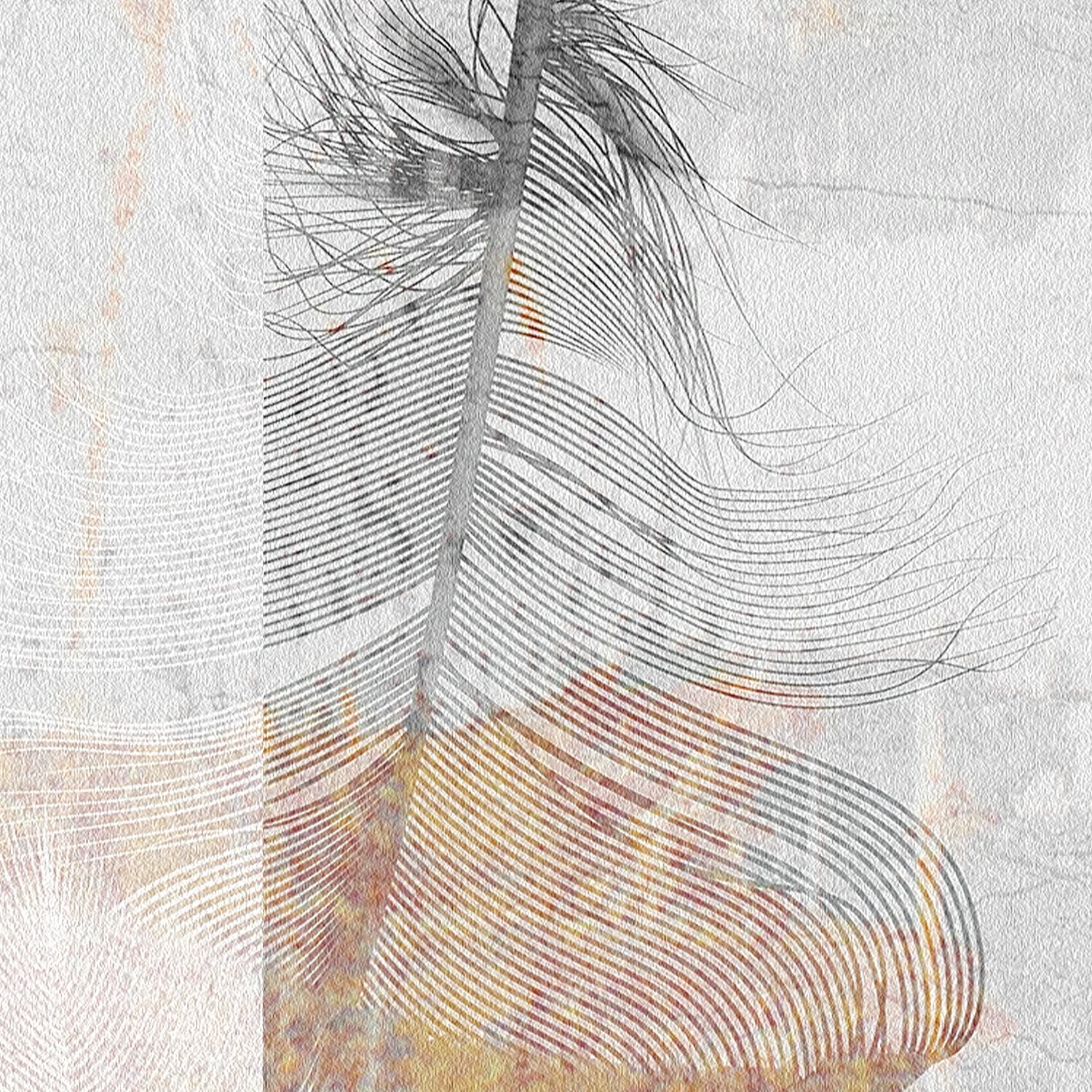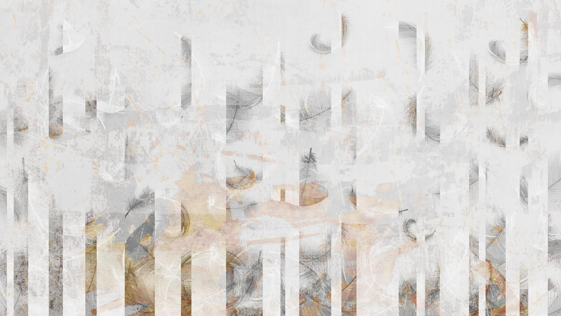 Illustration murale abstraite avec des plumes légères sur un fond géométrique gris.