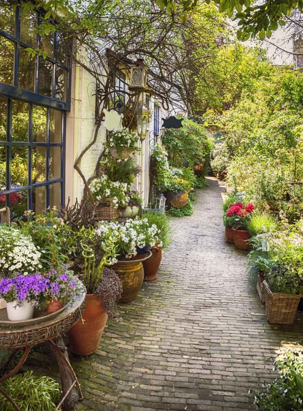 -Murale en papier peint d’une petite rue paisible remplie de fleurs.