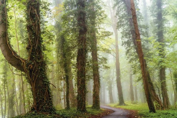 -Photo murale d’une forêt brumeuse en été avec un petit sentier qui la traverse. Un paysage paisible et chaleureux avec un effet trompe l’oeil intéressant.