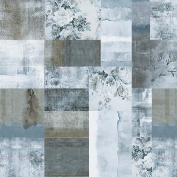 -Wall mural of a geometric and floral collage in shades of blue. An original design, which fits particularly well with a country or rustic decor.