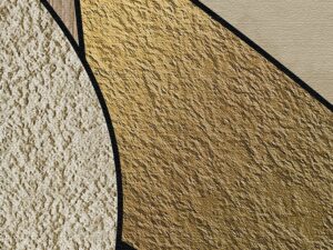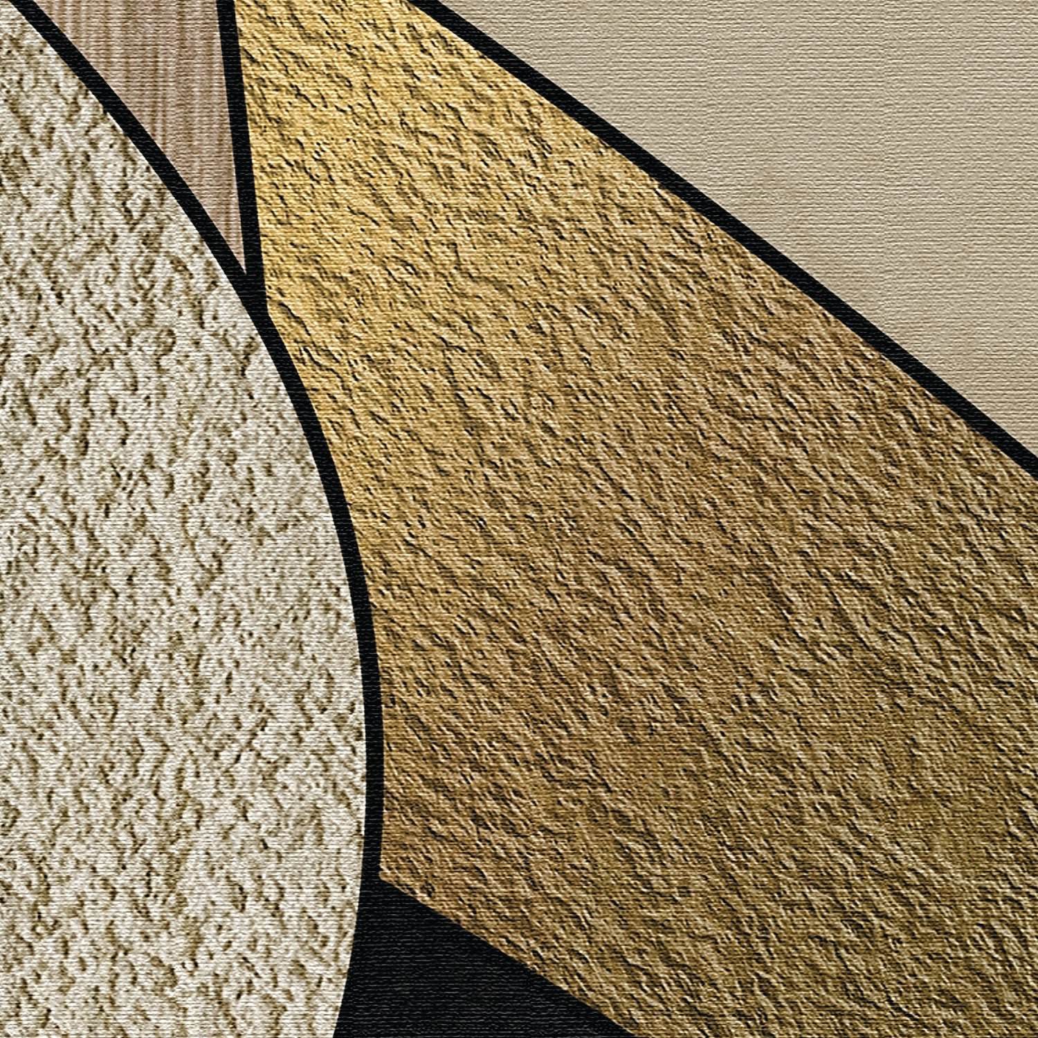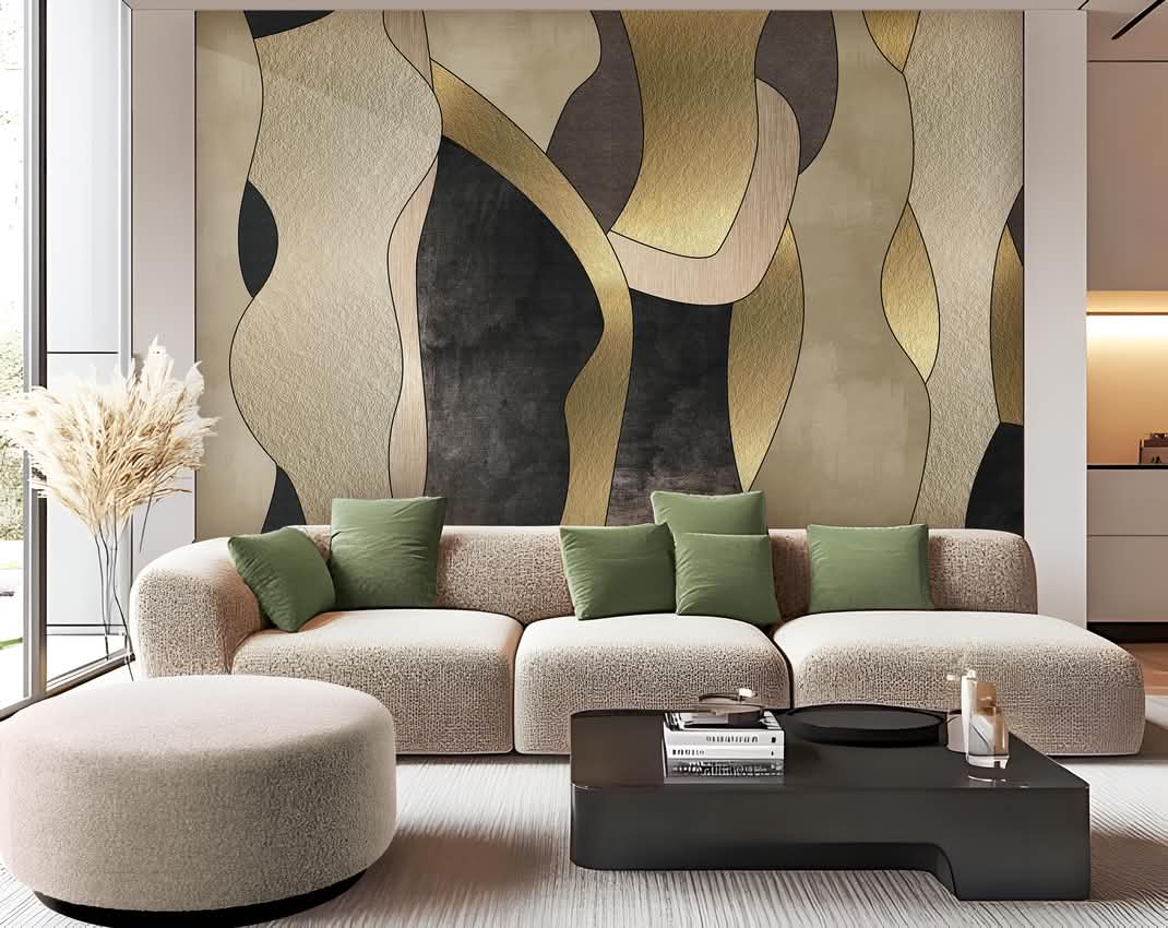 Stunning modern minimalist abstract wallpaper. Gold, beige, and black with curved shapes cut out with black outlines.