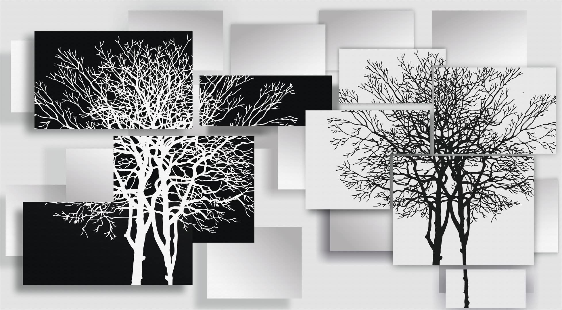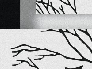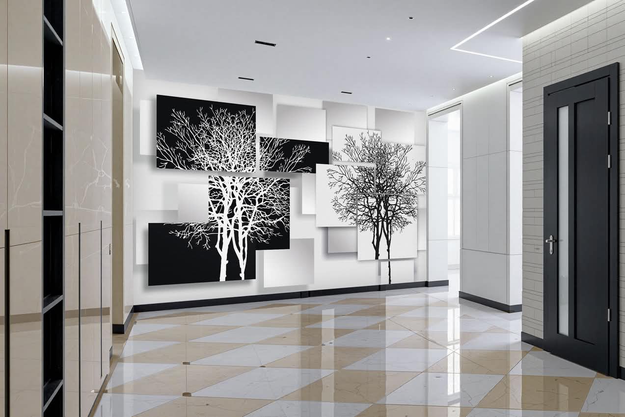 Impressive three-dimensional cubist mural featuring abstract trees. Simple, yet very dynamic.